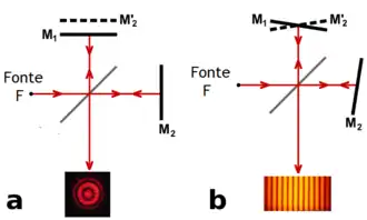 A característica do padrão de interferência depende da fonte da luz e precisamente da orientação dos espelhos e do espelho semitransparente. Em geral, se os espelhos (M1 e M2) estiverem posicionados como na situação a da figura ao lado, as franjas de interferência assumirão forma circular. Por outro lado, se os espelhos estiverem posicionados como na situação b, um cruzando o outro, as franjas de interferência tenderão a assumir forma paralela e serem igualmente espaçadas.