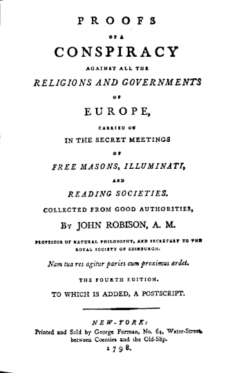 - Proofs of a Conspiracy against all the Religions and Governments of Europe, carried on in the Secret Meetings of Free-Masons, Illuminati and Reading Societies, etc., collected from good authorities, Edinburgh, 1797.