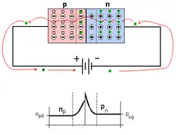 Neste caso, a bateria diminui a barreira de potencial da zona de carga espacial (cedendo elétrons livres à zona N e atraindo elétrons de valência da zona P), permitindo a passagem da corrente de elétrons através da junção; isto é, o diodo polarizado diretamente conduz a eletricidade.