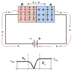 Na polarização inversa, o polo negativo da bateria é conectado à zona P e o polo positivo à zona N, o que faz aumentar a zona de carga espacial, e a tensão nesta zona até que se alcance o valor da tensão da bateria.[6]