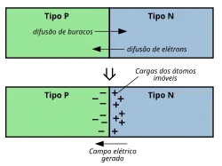 Quando a junção é formada, ocorre uma difusão de elétrons do cristal tipo N ao P e dos buracos (ou lacunas) do cristal tipo P ao N. Portanto, o material do tipo N que era inicialmente neutro, começa a ficar com uma deficiência de elétrons e consequentemente com carga positiva. O mesmo raciocínio vale para o lado P da junção, que começa a ficar com carga negativa. À medida que progride o processo de difusão, a zona de carga espacial vai aumentando sua largura aprofundando-se nos cristais em ambos os lados da junção. A acumulação de íons positivos na zona N e de íons negativos na zona P cria um campo elétrico (E) que atuará sobre os elétrons livres da zona N e sobre os buracos da zona P com uma determinada força que se oporá à corrente de difusão até que um equilíbrio seja atingido.