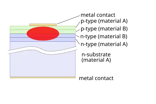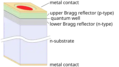 onde n é o índice de refracção da zona ativa, é o comprimento de onda pretendido para a monocromatização da onda no meio ativo e m refere-se à onda propriamente dita. É este tipo de cavidade que permite que a radiação fique confinada no meio ativo de tal modo que possa estimular decaimentos eletrónicos. Uma característica importante nestas heterojunções reside no modo em que a corrente elétrica passa por elas. Existem dois modos possíveis: a camada metálica dos extremos só existe por cima da zona ativa; deposição de uma camada isolante fora da zona ativa e posterior deposição da camada metálica; O material mais usado para as heterojunções do lado n e p no extremo são o AlxGa1-xAs e GaAs para o meio ativo p. É de referir que não é utilizado o silício como matéria prima dos lasers pelo facto da emissão espontânea e estimulada serem mais promovidas por processos de geração e recombinação diretos em vez de indiretos como acontece no silício. O funcionamento dos lasers com estrutura VCSEL é diferente deste último descrito por necessitar do tratamento quântico.