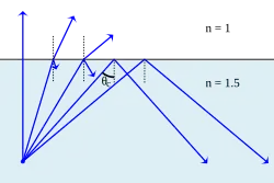 Quando a luz viaja de um meio com índice de refração maior para um com índice de refração menor, a Lei de Snell parece necessitar em alguns casos (quando o ângulo de incidência é suficientemente grande) que o seno do ângulo de refração seja maior que um. Isso claramente é impossível, e a luz nesses casos é completamente refletida pela fronteira, um fenômeno conhecido como reflexão interna total[5] O maior ângulo de incidência possível que ainda resulta em um raio refratado é chamado de ângulo crítico; nesse caso o raio refratado viaja ao longo da fronteira entre os dois meios.