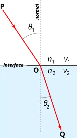 Conforme a luz cruza a fronteira entre os meios, dependendo dos índices de refração relativos entre os dois, a luz poderá ser refratada para um ângulo menor ou maior. Esses ângulos são medidos com respeito à linha normal, representada perpendicularmente à fronteira. No caso onde luz desloca-se do ar para a água, a luz seria refratada em direção à linha normal, pois a velocidade da luz diminui na água; já a luz deslocando-se da água para o ar seria refratada na direção oposta á linha normal.