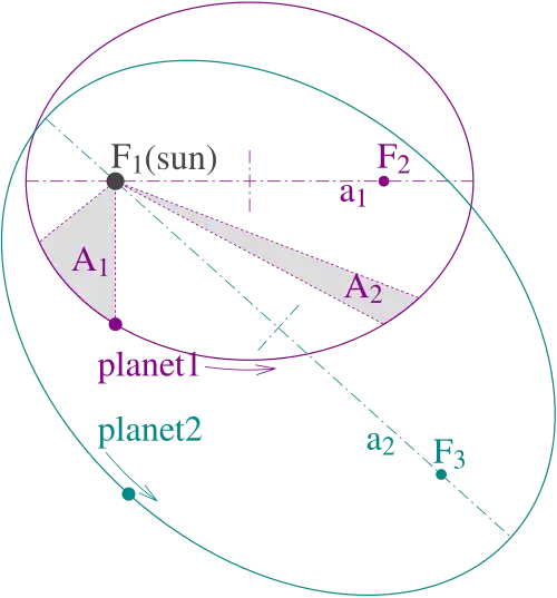 (1) As órbitas são elipses, com pontos focais ƒ1 e ƒ2 para o planeta 1 e ƒ1 e ƒ3 para o planeta 2. O sol está no ponto focal ƒ1.
