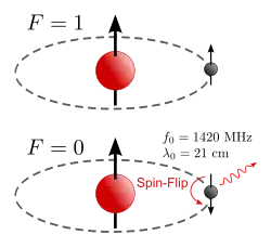 Um átomo de hidrogênio neutro consiste em um elétron ligado a um próton. O estado de energia estacionária mais baixo do elétron ligado é chamado de estado fundamental. Tanto o elétron quanto o próton têm momento de dipolo magnético intrínseco atribuído ao seu spin, cuja interação resulta em um ligeiro aumento de energia quando os spins são paralelos, e uma diminuição quando são antiparalelos. O fato de apenas estados paralelos e antiparalelos serem permitidos é resultado da discretização do momento angular total do sistema pela mecânica quântica. Quando os spins são paralelos, os momentos de dipolo magnético são antiparalelos (porque o elétron e o próton têm cargas opostas), assim seria esperado que esta configuração tivesse menor energia, assim como dois ímãs se alinharão de modo que o polo norte de um esteja mais próximo do polo sul do outro. Esta lógica falha aqui porque as funções de onda do elétron e do próton se sobrepõem; isto é, o elétron não está espacialmente deslocado do próton, mas o envolve. Os momentos de dipolo magnético são, portanto, melhor pensados como pequenos loops de corrente. Como correntes paralelas se atraem, os momentos de dipolo magnético paralelos (ou seja, spins antiparalelos) têm menor energia.[2] No estado fundamental, a transição de spin entre esses estados alinhados tem uma diferença de energia de 5,87433 μeV. Quando aplicada à relação de Planck, isso dá: