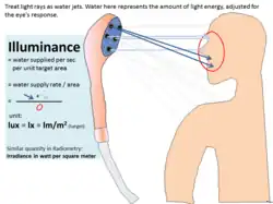 A iluminância é uma medida da forma como o fluxo luminoso é espalhado sobre uma determinada área. Pode-se pensar no fluxo luminoso (medido em lúmens) como uma medida da "quantidade" total de luz visível presente, sendo nesse caso a iluminância uma medida da intensidade da iluminação sobre uma superfície que receba esse fluxo luminoso. Uma determinada quantidade de luz iluminará uma superfície de maneira mais ténue se espalhada por uma área maior, de modo que a iluminância é inversamente proporcional à área quando o fluxo luminoso é mantido constante.