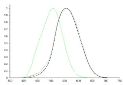 Curvas da função de luminosidade mostrando a sensibilidade do olho humano em visão fotópica (preto) e visão escotópica (verde).[18] A curva referente à visão fotópica inclui o padrão CIE 1931[19] (curva sólida), os dados modificados de Judd–Vos 1978[20] (tracejado), e os dados de Sharpe, Stockman, Jagla & Jägle 2005[21] (ponteado). O eixo horizontal é o comprimento de onda em nm.
