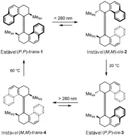 Um outro desenvolvimento importante foi o dos motores moleculares, moléculas que conseguem rodar unidirecionalmente em torno de seu eixo quando estimulada por luz, temperatura ou mudança no pH. O primeiro rotor molecular foi reportado por Bernard L. Feringa e colaboradores em 1999 na revista Nature.[16] O funcionamento desse motor está baseado na isomerização de uma ligação dupla que conecta dois grupos volumosos. A capacidade de isomerização da ligação dupla, combinada com a quiralidade das porções volumosas faz com que o movimento de giro seja em apenas uma direção. A primeira versão desse modelo era bastante simples, entretanto com o passar dos anos versões mais complexas foram sendo desenvolvidas, culminando no recentemente desenvolvimento de um Metal-Organic Framework em que um dos blocos de construção é um rotor molecular.[17]