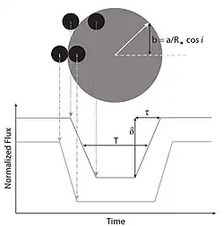 Um modelo teórico de curva de luz de um exoplaneta em trânsito prevê as seguintes características de um sistema planetário observado: profundidade do trânsito (δ), duração do trânsito (T), duração da entrada/saída (τ) e período do exoplaneta (P). No entanto, essas quantidades observadas são baseadas em várias suposições. Por conveniência nos cálculos, assumimos que o planeta e a estrela são esféricos, o disco estelar é uniforme e a órbita é circular. Dependendo da posição relativa que um exoplaneta em trânsito observado está enquanto transita por uma estrela, os parâmetros físicos observados da curva de luz mudarão. A profundidade de trânsito (δ) de uma curva de luz em trânsito descreve a diminuição do fluxo normalizado da estrela durante um trânsito. Isso detalha o raio de um exoplaneta em comparação com o raio da estrela. Por exemplo, se um exoplaneta transita por uma estrela do tamanho do raio solar, um planeta com um raio maior aumentaria a profundidade do trânsito e um planeta com um raio menor diminuiria a profundidade do trânsito. A duração do trânsito (T) de um exoplaneta é o período de tempo que um planeta passa transitando por uma estrela. Este parâmetro observado muda em relação a quão rápido ou lento um planeta está se movendo em sua órbita enquanto transita pela estrela. A duração da entrada/saída (τ) de uma curva de luz em trânsito descreve o tempo que o planeta leva para cobrir totalmente a estrela (entrada) e descobrir totalmente a estrela (saída). Se um planeta transita de uma extremidade do diâmetro da estrela para a outra extremidade, a duração da entrada/saída é menor porque leva menos tempo para um planeta cobrir totalmente a estrela. Se um planeta transita por uma estrela em relação a qualquer outro ponto que não seja o diâmetro, a duração da entrada/saída aumenta à medida que você se afasta do diâmetro, porque o planeta passa mais tempo cobrindo parcialmente a estrela durante seu trânsito.[9] A partir desses parâmetros observáveis, vários parâmetros físicos diferentes (semi-eixo maior, massa da estrela, raio da estrela, raio do planeta, excentricidade e inclinação) são determinados por meio de cálculos. Com a combinação de medições de velocidade radial da estrela, a massa do planeta também é determinada.