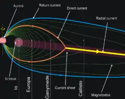 A corrente circulando da ionosfera até a folha de plasma é especialmente forte quando a parte correspondente da folha de plasma possui um período de rotação menor do que o do planeta.[30] Como mencionado anteriormente, a corrotação começa a desaparecer na região localizada entre 20 e 40 Rj de Júpiter. Esta região corresponde ao disco magnético, no qual o campo magnético é bastante esticado.[31] A forte corrente direta circulando no disco magnético origina-se entre 16±1° de latitude dos polos magnéticos de Júpiter. Estas regiões circulares correspondem às principais ovais de auroras de Júpiter.[32] A corrente que volta da região externa da magnetosfera, além de 50 Rj, entra na ionosfera jupiteriana próximo aos polos, fechando o circuito elétrico. Estima-se que o total da corrente radial na magnetosfera jupiteriana seja em torno de 60–140 milhões de ampères.[22][30]
