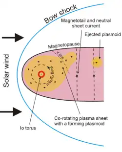 Quando tubos de fluxo carregados com plasma frio de Io alcançam a região externa da magnetosfera, eles passam por um processo de reconexão, que separa o campo magnético do plasma.[31] O primeiro retorna à região interna da magnetosfera como tubos de fluxo carregados com plasma quente e menos denso, enquanto que o último é provavelmente ejetado no rabo magnético, como plasmoides. Os processos de reconexão podem corresponder aos eventos de reconfiguração global que foram observados pela Galileu, que ocorreram a cada dois ou três dias.[36] Os eventos de reconfiguração geralmente incluíam variações rápidas e caóticas da força e direção do campo magnético, bem como mudanças abruptas no movimento de plasma, o qual muitas vezes parava a corrotação e começava a correr em direção oposta ao planeta. Estes eventos foram observados principalmente nas regiões de alvorada da magnetosfera.[36] O plasma fluindo no rabo pelas linhas de campo abertas é chamado de vento planetário.[19][37]