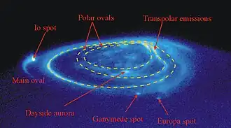 Manchas atribuídas aos satélites galileanos Io, Europa e Ganímedes foram encontradas.[nota 5][50] Estas manchas desenvolvem-se porque a corrotação do plasma é diminuída na vizinhança dos satélites. A mancha mais brilhante pertence a Io, que é a principal fonte de plasma da magnetosfera. Acredita-se que a mancha auroral de Io é causada por correntes de Alfvén circulando da ionosfera de Júpiter para a de Io. As manchas de Europa e de Ganímedes são muito mais fracas, porque estes satélites são pequenos fornecedores de plasma para a magnetosfera jupiteriana, devido à sublimação do gelo de água em suas superfícies.[51]