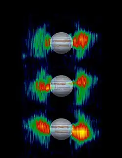 Júpiter é uma poderosa fonte de ondas de rádio, cuja frequência varia entre vários kHz até dezenas de MHz. Ondas de rádio com frequências de menos de 0,3 MHz (e, consequentemente, com comprimento de onda maior que um quilômetro) são chamadas de radiação jupiteriana quilométrica, ou KOM. Aquelas com frequência entre 0,3 e 3 MHz (com comprimento de onda entre 100 e 1 000 metros) são chamadas de radiação hectométrica, ou HOM, enquanto que emissões entre 3 e 40 MHz (com comprimentos de onda entre 10 e 100 m) são chamadas de radiação decamétrica, ou DAM. Este último formato de radiação foi o primeiro a ser observado da Terra, e sua periodicidade de 10 horas facilitou sua identificação como originário de Júpiter. A parte mais forte das emissões decamétricas está relacionada com Io e o sistema de corrente Io-Júpiter e é chamada de Io-DAM.[54][nota 6]