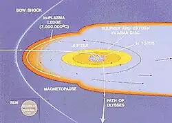 Embora em geral o formato da magnetosfera de Júpiter seja parecido com o da Terra, nas proximidades do planeta a estrutura da magnetosfera jupiteriana é bastante diferente da terrestre..[13] O satélite Io, que é vulcanicamente ativo, é uma fonte considerável de plasma e alimenta a magnetosfera jupiteriana com até 1 000 kg de novo material cada segundo.[6] Fortes erupções vulcânicas em Io emitem grandes quantidades de dióxido de enxofre, a maior parte do qual é dissociada em átomos e ionizada pela radiação ultravioleta solar, produzindo íons de enxofre e oxigênio: S+, O+, S2+ e O2+[19] Estes íons escapam da atmosfera de Io e formam o "toro de plasma de Io": uma região anelar composta por plasma relativamente frio, circulando Júpiter, localizado próximo à orbita de Io.[6] A temperatura do plasma dentro do toro é de 10–100 eV (100 000–1 000 000 K), o que é muito mais baixo que a temperatura das partículas nos cinturões radioativos — 10 keV (100 milhões K). O plasma no toro é forçado em corrotação com Júpiter, o que significa que ambos possuem o mesmo período de rotação.[20] O toro de Io altera fundamentalmente a dinâmica da magnetosfera jupiteriana.[21]