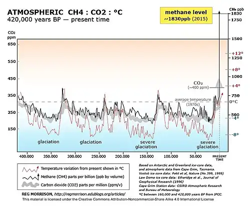 A ilustração da EPA de 2016 acima é uma compilação de dados de paleoclimatologia mostrando as concentrações de metano ao longo do tempo com base na análise de bolhas de gás[80] do projeto EPICA Domo C, Antártida — aproximadamente 797.446 a.C. a 1937 d.C.,[81] Domo Law, Antártida — aproximadamente 1008 d.C. a 1980 d.C.,[82] Cabo Grim, Austrália — 1985 d.C. a 2015 d.C.,[83] Mauna Loa, Havaí — 1984 d.C. a 2015 d.C.[84] e ilhas Shetland, Escócia: 1993 d.C. a 2001 d.C.[85]