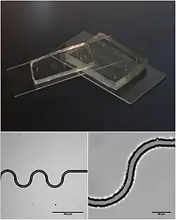 Dispositivos microfluídicos baseados em polímero de silicone e vidro. Em cima: Fotografia dos dispositivos. Em baixo: Imagens de contraste de fase de um canal serpentino com ~15 μm de largura.