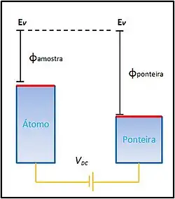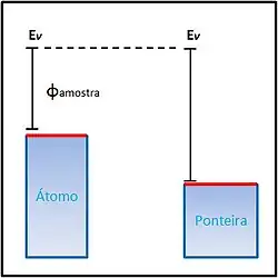 Uma vez que a energia de Fermi da ponteira é menor então haverá um decréscimo na energia de Fermi da superfície. O ponto crucial consiste em saber que a função trabalho dos elétrons na superfície da amostra não muda, pois é uma característica inerente ao átomo e desta forma o intervalo φamostra de diferença entre a energia do elétron de Fermi e a energia do elétron no “vácuo” Ev também é deslocada para baixo.