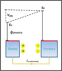 Inicialmente a ponteira e a amostra estão distanciadas, ambas com suas funções trabalho e energias de Fermi diferentes. O procedimento em seguida consiste em colocá-las muito próximas propiciando o fenômeno de Tunelamento quântico e consequentemente propiciando a igualação das energias de Fermi. Tanto a ponteira (sonda) quanto a superfície tornam-se carregadas.