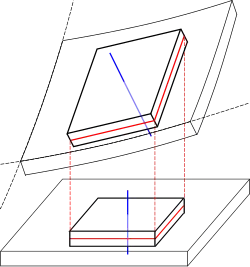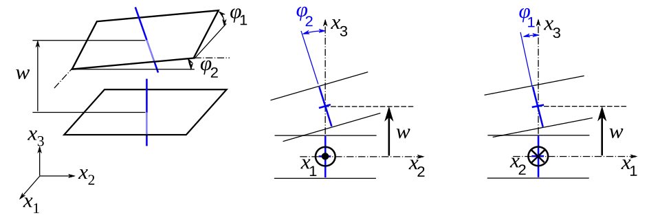 Este deslocamento pode ser decomposto em uma soma vetorial do deslocamento da superfície média e um deslocamento perpendicular ao plano na direção . Podemos escrever o deslocamento no plano da superfície média como