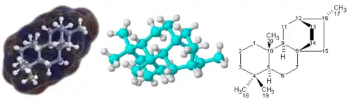 Representações 3D (esquerda e central) e 2D (direita) da molécula terpenóide atisane