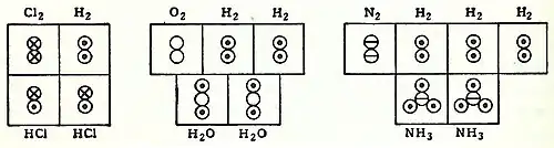 Em coordenação com estes conceitos, em 1833 o químico francês Marc Antoine Auguste Gaudin apresentou uma explicação clara da hipótese de Avogadro,[19] em relação aos pesos atómicos, fazendo uso de "diagramas de volume", que mostram claramente geometrias moleculares semi-corretas, como uma molécula de água linear, e fórmulas moleculares corretas, como H 2 O: