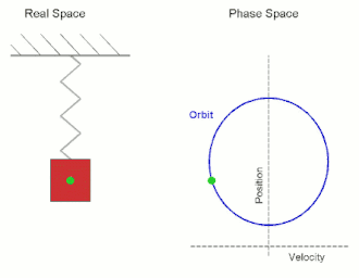 Quando a massa se aproxima da posição de equilíbrio, a força restauradora diminui. Na posição de equilíbrio, a força resultante restaurada desaparece. No entanto, em x= 0, a força da massa não desaparece devido ao impulso da força restauradora que agiu sobre ele. Portanto, a massa continua além da posição de equilíbrio, comprimindo a mola. Então, a força resultante restaurada tende a desacelerar, até a sua velocidade desaparecer, tentando chegar novamente à posição de equilíbrio.[1]