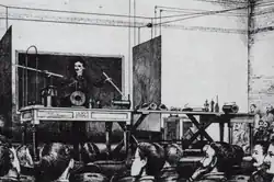 A Tesla visitou a feira por uma semana durante seus seis meses de duração para participar do Congresso Internacional de Eletricidade e realizar uma série de demonstrações na exposição Westinghouse.[110][111] Uma sala especialmente escura havia sido montada, onde Tesla mostrava seu sistema de iluminação sem fio, usando uma demonstração que ele havia realizado anteriormente na América e na Europa;[112] incluíam o uso de corrente alternada de alta tensão e alta frequência para acender lâmpadas de descarga de gás sem fio. [113]