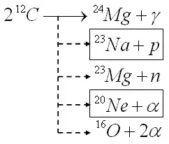 Terminada a fusão do hélio, o núcleo volta a comprimir-se e a elevar sua temperatura. Dos três elementos que compõem a maior parte do núcleo neste estágio (carbono e oxigênio em 90%, mais um pouco de neônio), o carbono é o que tem a temperatura de fusão mais baixa, uns 600 milhões de graus (6•108 K). Ao chegar a esta temperatura e a uma densidade de uns 2×108 kg/m3, os átomos de carbono começam a reagir entre si, dando lugar a diversos elementos mais pesados através de uma série de canais de saída distintos. A duração desta etapa será da ordem de umas centenas de anos, podendo chegar aos mil anos. As reações mais prováveis são as que estão apresentadas no diagrama. A do sódio-23 tem uns 56% de ocorrência e a do neônio-20 uns 44%. Os prótons e as partículas alfa emitidas em tais reações serão rapidamente recapturados pelo carbono, o oxigênio, o neônio e o próprio sódio. Estas reabsorções não têm efeitos energéticos significativos, mas são relevantes no que diz respeito à nucleossíntese, pois farão com que o sódio não esteja presente entre os elementos residuais da fusão do carbono. Quanto ao oxigênio, ainda que se forme pouco, ele se soma ao que já havia sido formado durante o processo triplo alfa. Tudo isto fará com que resulte um núcleo de oxigênio-16, neônio-20, magnésio-24 e alguns traços de silício-28. A composição das cinzas desta etapa é fundamentalmente a seguinte: