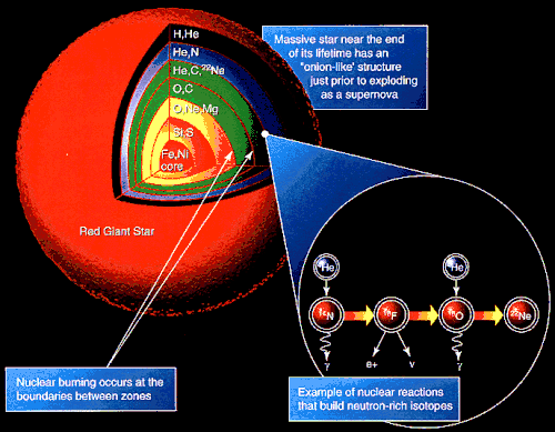 Secção de uma gigante vermelha mostrando a nucleossíntese e os elementos formados.