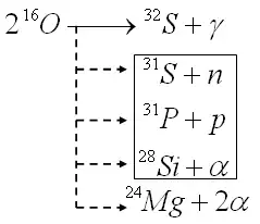 Finalizada a etapa do neônio, o núcleo da estrela volta a se aquecer e contrair até 1,5 a 2•109 K e 107 g/cm³, temperatura e densidade a partir das quais se alcança a ignição do oxigênio. A reação de fusão nuclear do oxigênio produz diversos canais de saída, uns mais prováveis que outros, do mesmo modo que ocorria na fusão do carbono. A etapa dura uns poucos meses, talvez um ano, e suas cinzas são sobretudo silício-28, acompanhado de silício-30, enxofre-34, cálcio-42 e titânio-46. Muitos destes elementos são subprodutos das reações com prótons, nêutrons ou alfas recapturados. As três reações mais prováveis são as que estão apresentadas. Resultará enxofre-31 em 18% das vezes, fósforo-31 em 61% e silício-28 em 21% das vezes.