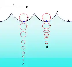 As órbitas têm um raio maior perto da superfície e vão tendo cada vez um raio menor até que deixam de existir a uma profundidade que é cerca de metade da distância entre as cristas das ondas (ou seja, metade do comprimento de onda de propagação).