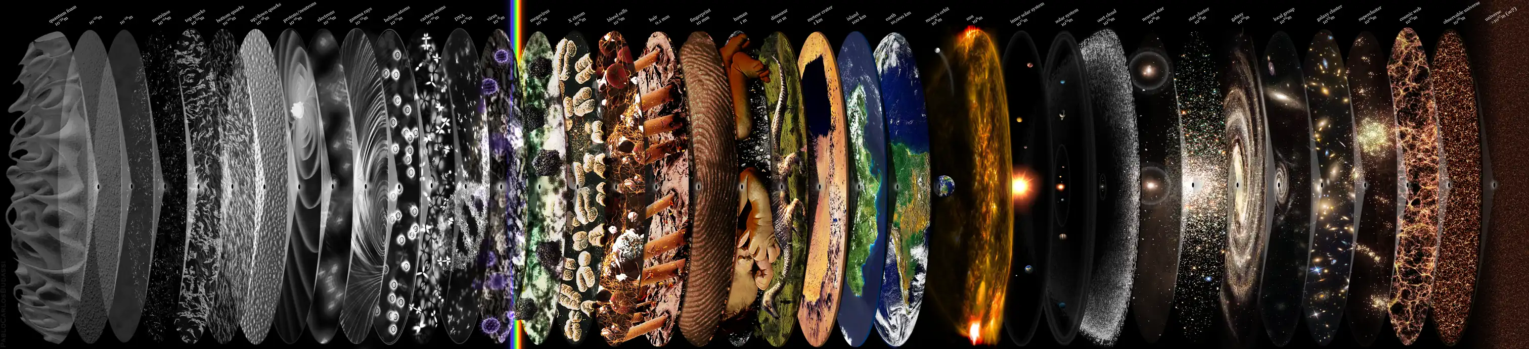 Exemplos de objetos de diferentes ordens de magnitude. 10-32 espuma quântica. 10 -24 m raio de um neutrino. 10 -22 m Quark Top, o menor quark. 10-20 m Quarks Bottom and Charm. 10-18 m Quarks para cima e para baixo. 10-16 m prótons e nêutrons. 10-14 m Elétrons e núcleos. 10-12 m raios gama. 10-11 m Raio dos átomos de hidrogênio e hélio. 10-10 m Raio de átomos de carbono. 10-9 m de diâmetro de hélice de DNA. 10-8 m Vírus menor (circovírus suíno). 10-7 m O maior vírus (megavírus). 10-6 m Cromossomo X. 10-5 m Tamanho típico de uma célula vermelha do sangue. 0.1mm Largura do cabelo humano. 10 mm de largura de um dedo humano adulto. 1m Altura de um ser humano infantil. 10m Argentinossauro (30 a 35 metros). 1 km de diâmetro da cratera Barringer (1186m). 100 km da Ilha da Jamaica (235 km de comprimento). 10000 km de diâmetro do planeta Terra (12.742 km). 108 Órbita da Lua (770.000 km). 109 m Diâmetro do Sol (1391400km). 1011 m Diâmetro do sistema solar interno. (600.000.000 km). 1013 m Diâmetro do sistema solar. 1015 Limite externo da nuvem de Oort. 1016 m Distância para Alpha Centauri. 1018 m Cluster globular Messier 13. 1020 m Diâmetro da Via Láctea. 1022 m Grupo local de galáxias. 1023 m Cluster de galáxias típico (2 a 10 Mpc). 1024 superaglomerado Laniakea de galáxias (160 Mpc). 1025 m Rede cósmica. 1026 m Diâmetro da esfera do universo observável. O universo inteiro é maior que 10 27 me possivelmente infinito.