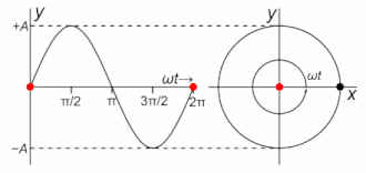 O diagrama à direita mostra um ponto (preto) girando em um círculo de raio A sobre a origem. O ângulo que ele faz com o eixo x a qualquer momento t é ωt, onde ω é sua velocidade angular em radianos por segundo. Sua projeção no eixo y (vermelho) mostra um movimento harmônico simples, dado por y (t) = Asin (ωt). O diagrama da esquerda mostra o movimento plotado como uma função de ωt.