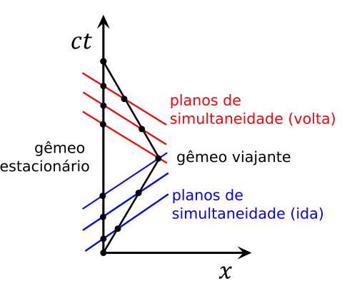 Para uma compreensão momento a momento de como a diferença de tempo entre os gêmeos se desenrola, é preciso entender que na relatividade especial não há conceito de presente absoluto. Para diferentes referenciais inerciais, há diferentes conjuntos de eventos que são simultâneos naquele referencial. Essa relatividade da simultaneidade significa que alternar de um referencial inercial para outro requer um ajuste em qual fatia do espaço-tempo conta como o "presente". No diagrama do espaço-tempo à direita, desenhado para o referencial do gêmeo baseado na Terra, a linha do mundo desse gêmeo coincide com o eixo vertical (sua posição é constante no espaço, movendo-se apenas no tempo). Na primeira etapa da viagem, o segundo gêmeo se move para a direita (linha preta inclinada); e na segunda etapa, de volta para a esquerda. As linhas azuis mostram os planos de simultaneidade para o gêmeo viajante durante a primeira etapa da jornada; as linhas vermelhas, durante a segunda etapa. Pouco antes da reviravolta, o gêmeo viajante calcula a idade do gêmeo baseado na Terra medindo o intervalo ao longo do eixo vertical da origem até a linha azul superior. Logo após a reviravolta, se ele recalcular, ele medirá o intervalo da origem até a linha vermelha inferior. Em certo sentido, durante a reviravolta, o plano de simultaneidade salta do azul para o vermelho e varre muito rapidamente um grande segmento da linha do mundo do gêmeo baseado na Terra. Quando alguém transfere do referencial inercial de saída para o referencial inercial de entrada, há uma descontinuidade de salto na idade do gêmeo baseado na Terra[22][23][27][29][30] (6,4 anos no exemplo acima).