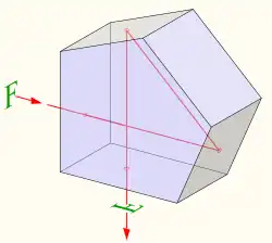 Um desenho em perspectiva mostrando a configuração mais usual de um pentaprisma de topo em uma câmera reflex monobjetiva (SLR). A imagem é invertida lateralmente.