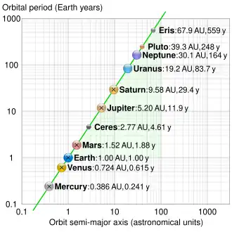 De acordo com a Terceira Lei de Kepler, o período orbital T (em segundos) de duas massas pontuais orbitando uma à outra em uma órbita circular ou elíptica é:[2]