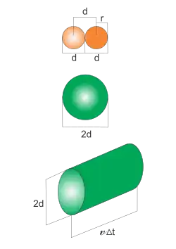 Outra maneira de perceber o percurso livre médio, é imaginar duas moléculas chocando-se (figura ao lado). Cada molécula possui raio e diâmetro . Para ocorrer uma colisão, é preciso que os centros das duas moléculas estejam a uma distância igual ao diâmetro. Por simplificação, supõe-se que apenas uma outra molécula, de raio e diâmetro , está se movendo. Nesse caso, quando a molécula em questão move-se por um certo período de tempo , ela varre um cilindro com volume igual a . O número de moléculas no interior desse cilindro é igual ao número de colisões; logo, multiplicando-se o resultado anterior por , que representa a concentração de moléculas, onde é o número de moléculas e é o volume total, obtém-se o número de colisões. Sendo a distância percorrida, tem-se que: