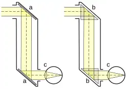 Em sua forma mais simples, consiste em uma caixa externa com espelhos em cada extremidade colocados paralelamente entre si em um ângulo de 45°. Esta forma de periscópio, com a adição de duas lentes simples, serviu para fins de observação nas trincheiras durante a Primeira Guerra Mundial. Os militares também usam periscópios em algumas torres de artilharia e em veículos blindados.[1]