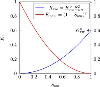 Uma aproximação muitas vezes utilizada de permeabilidade relativa é a correlação Corey que é lei de potência na saturação de água .[3][4] Se (também denotada , ou , ou ) é a saturação de água irreduzível (mínima), e é a saturação de óleo residual (mínima) após a inundação de água (note-se que é a saturação de óleo), podemos definir um valor de saturação de água normalizado (ou escalado)