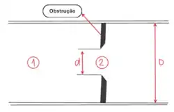 Contudo, tal equacionamento só é válido para o cenário ideal onde a perda de carga pelo atrito é nula. Para o contexto real, sabe-se que a obstrução da passagem(diminuição repentina da passagem do fluido a partir de uma diminuição do diâmetro do tubo), acarreta em perda de energia decorrente desse atrito causado entre o fluido e as paredes do tubo. Portanto, para uma medida real, adiciona-se um parâmetro, , à equação a fim de se considerar esse efeito.