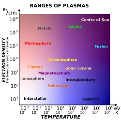 - ↑ Note que plasmas não térmicos ou não equilibrados não são tão ionizados e têm densidades energéticas menores, logo a temperatura não é distribuída por igual entre as partículas, com o que algumas pesadas permanecem 'frias'.