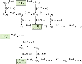 • Pu-242, produzido pela captura neutrônica de Pu-241 sem resultar em uma fissão (27% dos casos como visto anteriormente). Tem a segunda maior meia-vida dentre os isótopos de plutônio, com 373 300 anos, 15 vezes mais longa que o do Pu-239.[49] Não é físsil, mas como o Urânio-238 ele é fissionável por nêutrons rápidos (nêtrons com energia superior a 1 MeV, ou seja saem a mais de 14 000 km por hora), poderiam ser empregados em armas termonucleares para serem fissionados pelos nêutrons criados pela fusão nuclear de deutério e trítio que liberam nêutrons de 14,1 MeV(atingindo 52 000 km por hora, 17,3% da velocidade da luz.