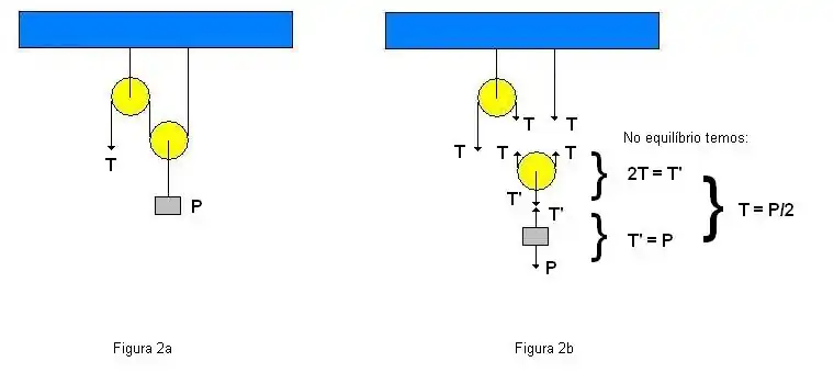 A figura 2 logo abaixo mostra uma aplicação de polias para reduzir a força necessária para levantar um objeto. Nessa configuração com duas polias, a força de tração T necessária para segurar um objeto de peso P é igual à metade P: