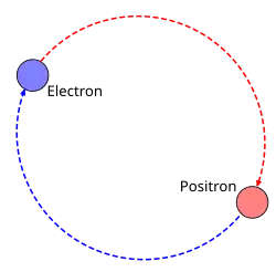 Um elétron e um pósitron orbitando ao redor de um centro de massa comum formando a estrutura conhecida como positrônio.