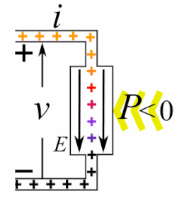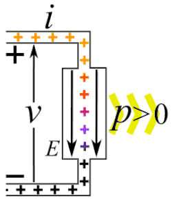 - Dispositivos passivos ou cargas: Quando os elétrons movem-se de um ponto com maior potencial elétrico para um com menor potencial elétrico, isto é, quando a corrente convencional (carga positiva) move-se do terminal positivo (+) para o negativo (-), trabalho é realizado pelas cargas no dispositivo. Esses dispositivos são chamados de componentes passivos ou cargas; eles "consomem" potência elétrica do circuito, convertendo-a em outras formas de energia, tais como trabalho mecânico, calor, luz, etc. Exemplos são eletrodomésticos como lâmpadas, motores e aquecedores.
