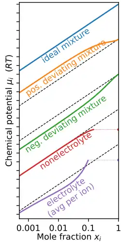 Em uma mistura ou solução, o potencial químico de uma substância depende fortemente de sua concentração relativa, o que é comumente quantificada por fração molar . A dependência exata é sensível à substância, o solvente e a presença de quaisquer outras substâncias na solução. No entanto, dois comportamentos universais aparecem nos extremos de concentração:[19][20]