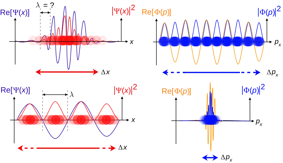 Topo: Se o comprimento de onda λ for desconhecido, o momento p, o vetor de onda k e a energia E também o são (relações de Broglie). Como a partícula é mais localizada no espaço de posição, Δx é menor do que para Δpx.