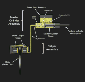 Um esquema ilustrando melhor o funcionamento dos componentes de um sistema hidráulico de freio a disco. Nele, o princípio de Pascal é utilizado para amplificar a força de brecagem.