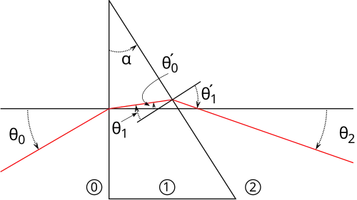 O desvio do ângulo do raio e a dispersão através de um prisma podem ser determinados traçando um raio de amostra através do elemento e usando a lei de Snell em cada interface. Para o prisma mostrado à direita, os ângulos indicados são dados por